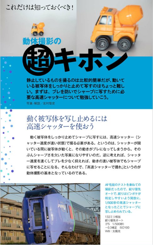 こんな感じで、「なぜシャッタースピードが動体撮影に重要なのか」というところから丁寧に説明してくれています。撮った写真の情報も写真の横に掲載されているので、シャッタースピードや露出補正など設定するときの参考にもなります。