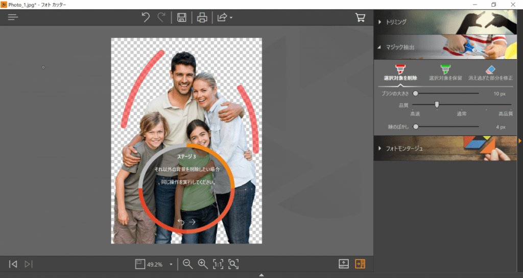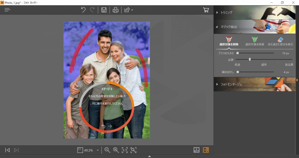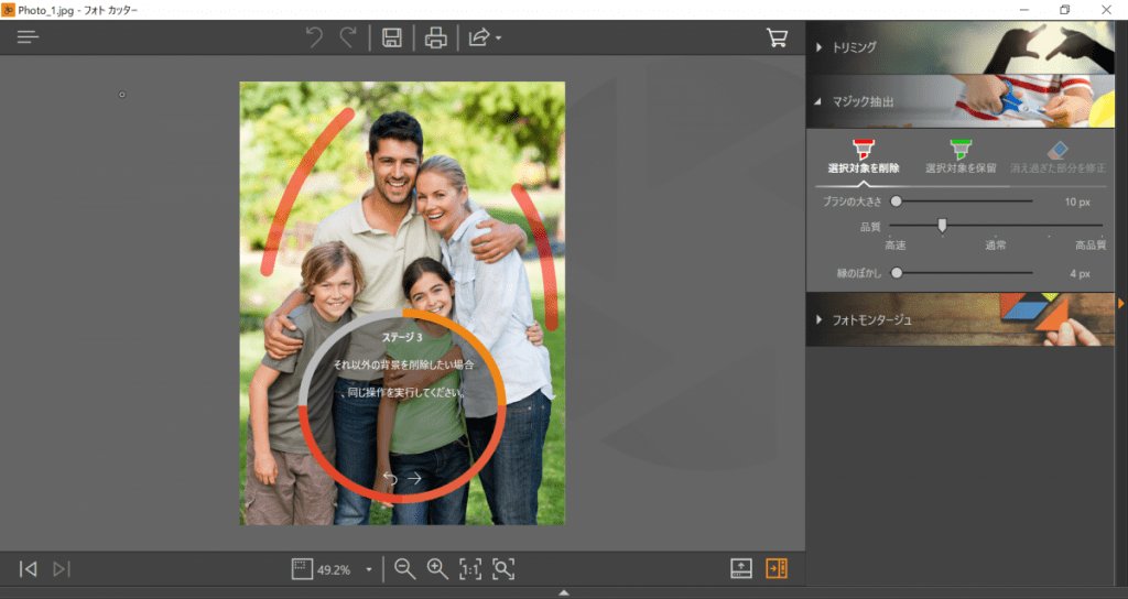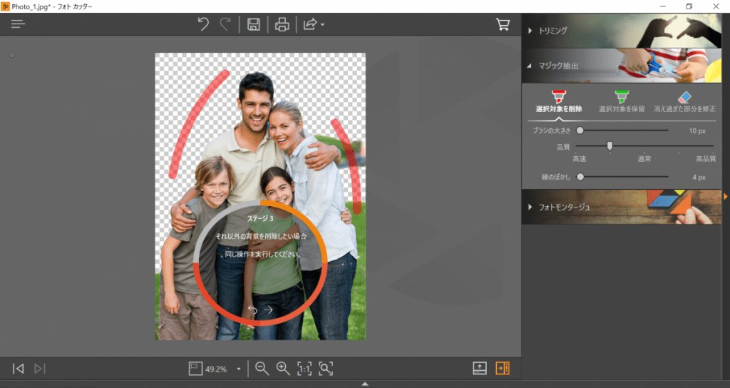 まずは指示通り、右側のメニューにある「マジック抽出」の中から、「選択対象を削除」をクリック。これで、選択した範囲を削除するモードに切り替わります。