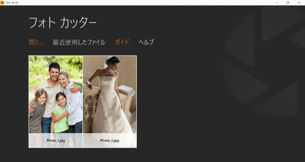 フォトカッターを開くと、上に「ガイド」というメニューがあるのでクリック。