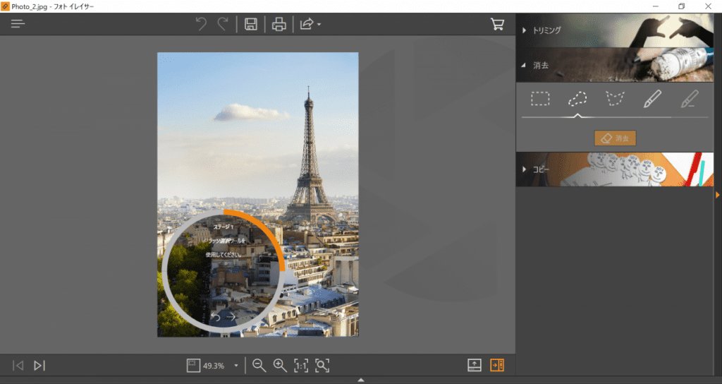 次は、画像の中の不要な部分を消去するツール、「フォトイレイサー」を使ってみます。
