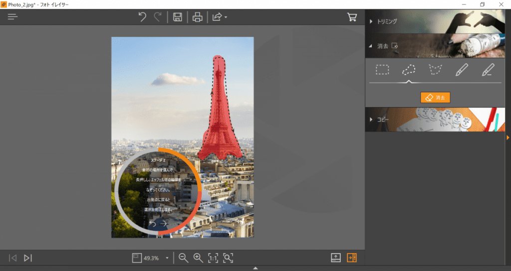 エッフェル塔を囲めたら、右側のオレンジのボタン「消去」をクリックします。