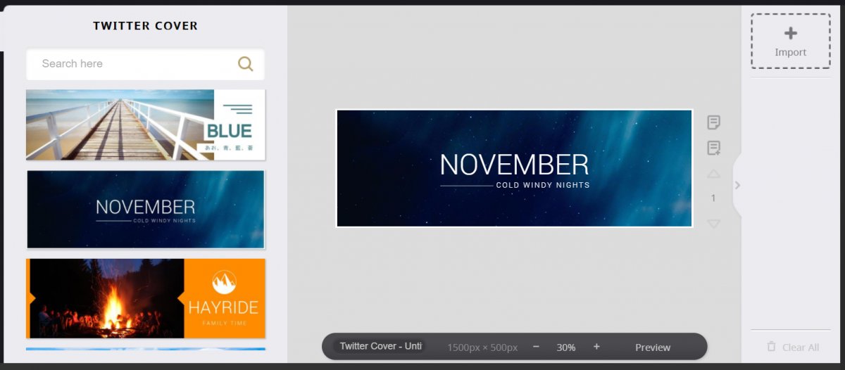 【Twitterカバー作成機能】では、選んだテンプレートに好きな画像を読み込めるのはもちろん、カラーやフォント、構図などいろんなカスタマイズができるようになっています。