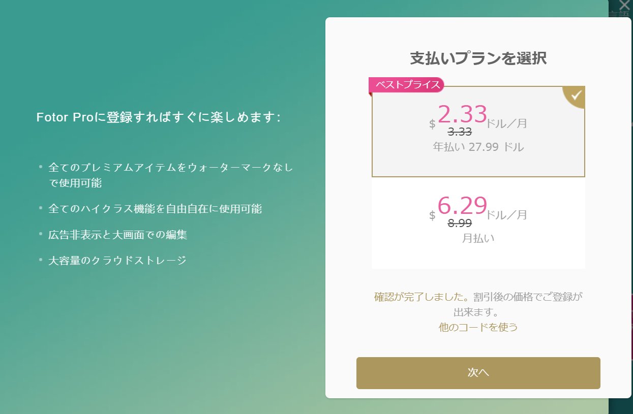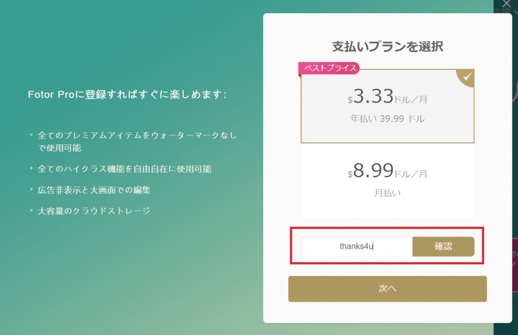 Fotor Proの登録画面にある割引コード欄に「thanks4u」と入力し、右の「確認」を押します。