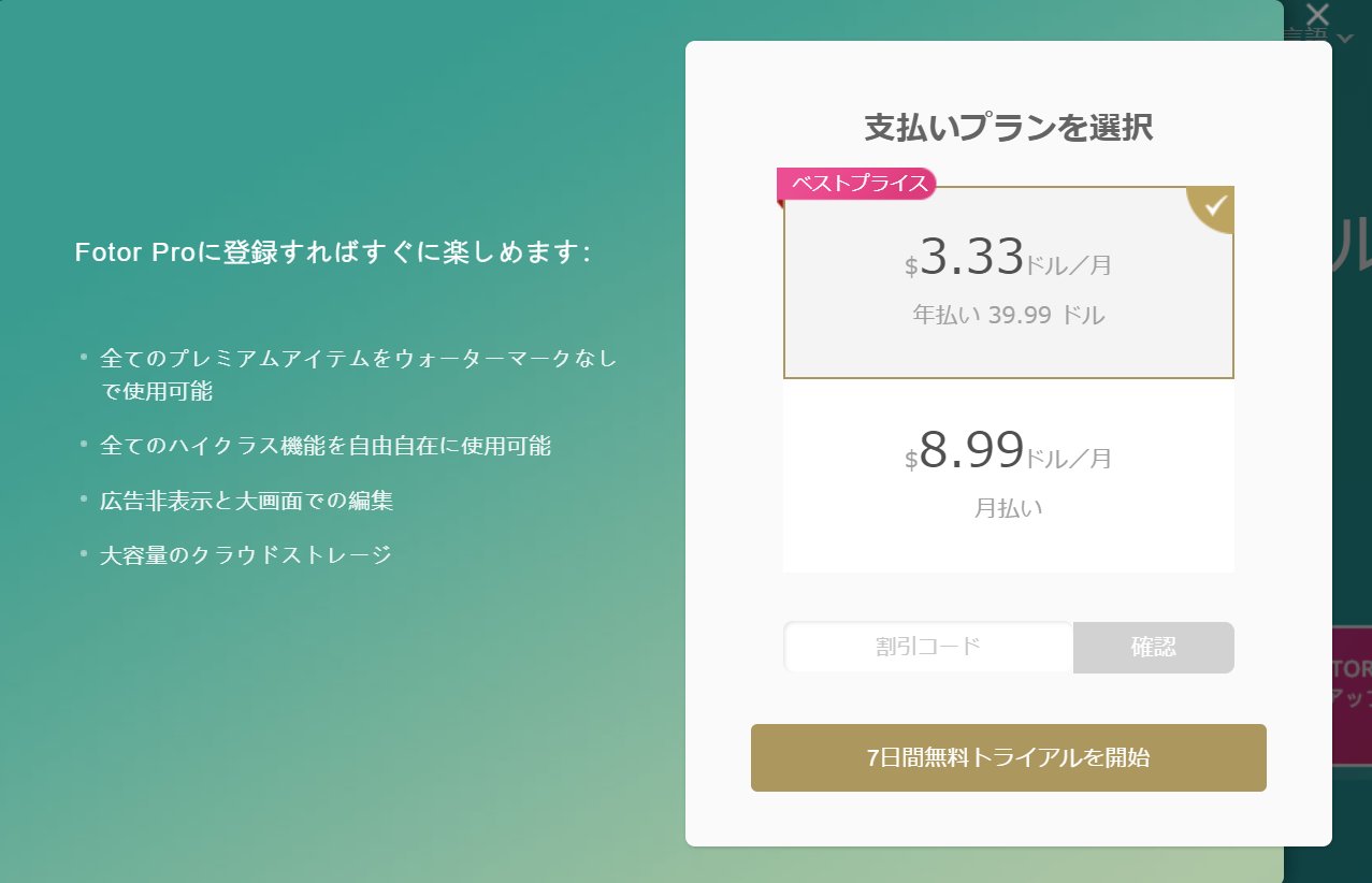 実はFotorにはフリー版では制限されている機能があります。Pro版に申し込むことで制限の解除、さらに特典を受けることができます。