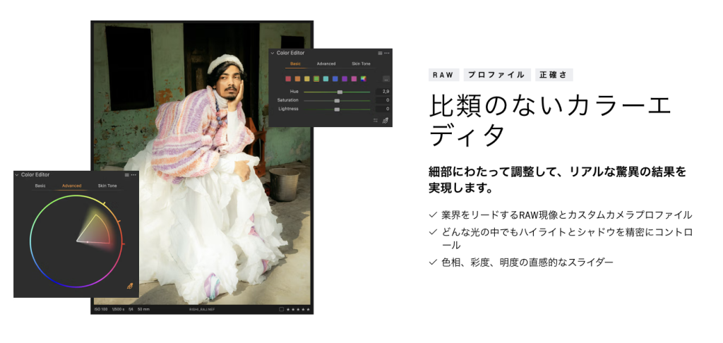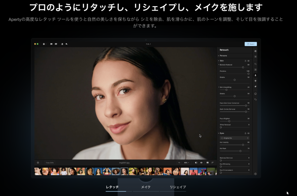 基本的なレタッチ機能に加えて、AIですばやく綺麗にレタッチできる機能がたくさん搭載されていて、シワや地味の除去や虹彩の色変更、ライティングを後から調整するなどの調整が可能です。