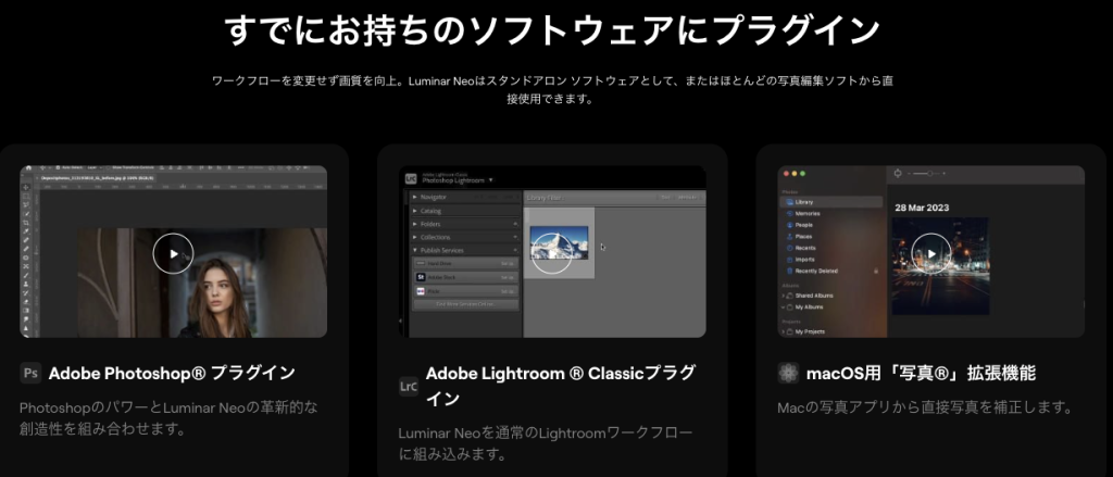 また、Luminar NeoはプラグインとしてLightroomやPhotoshop、Macの写真内でも使うことができます。