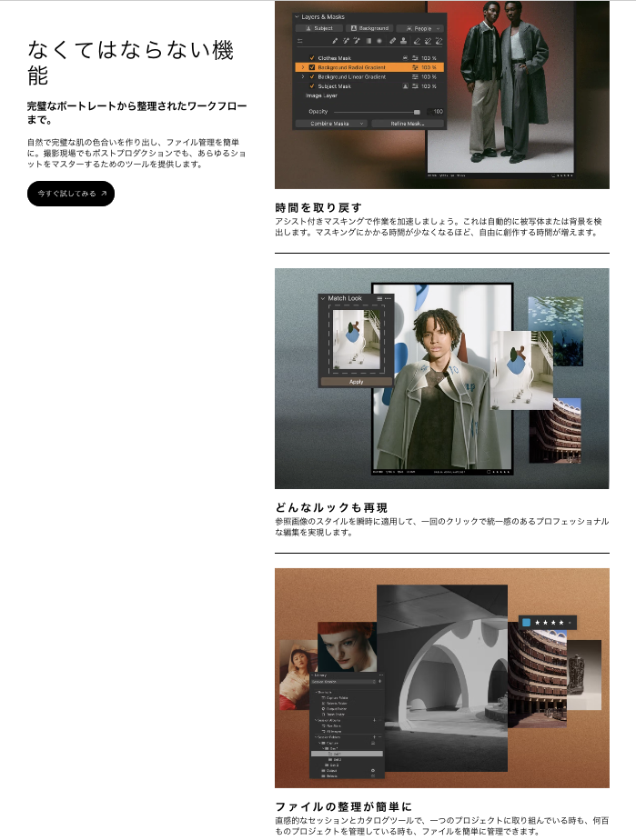 | AI機能で効率を上げたい | Luminar Neo | AI機能が充実していてUIも直感的で使いやすい。 |