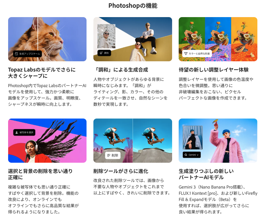 2026年版はアップデートでAI機能がさらに充実するようで、小さいエリアを引き伸ばして大きいサイズにすることができたり、ノイズが乗ってしまった写真を綺麗にする、画像の足りない部分をAIで生成するなど機能がさらに増えていくそうです。