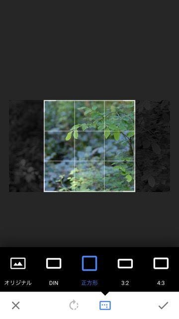画面下の長方形のアイコンをタップすると、うrに正方形や4:3などよく使われるサイズが出てくるので、使いたいものを選びます。