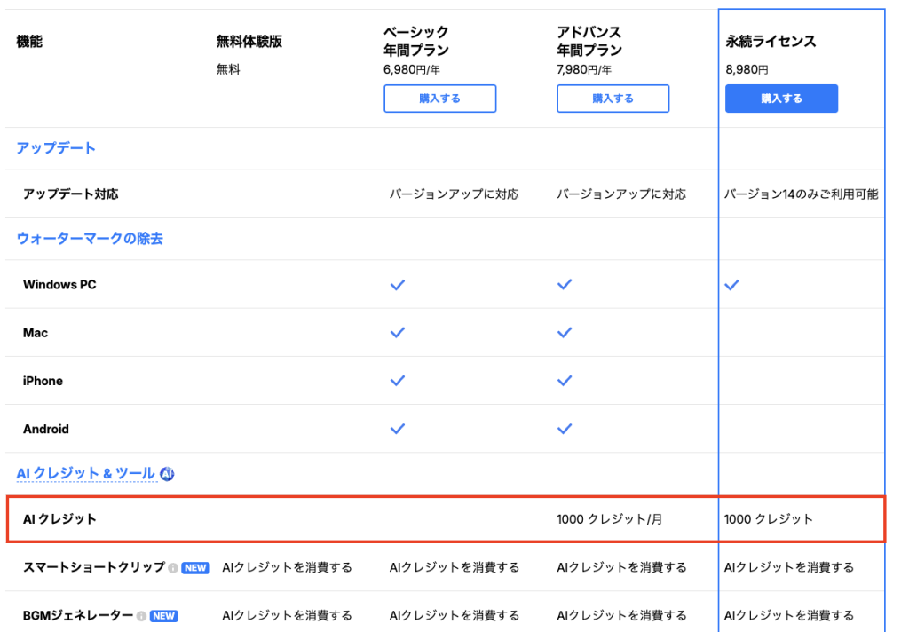 5000クレジットなど多めのクレジットを一括で買うと割安になるので、AI機能をよく使う方は下の料金プランを比較してみてください。
