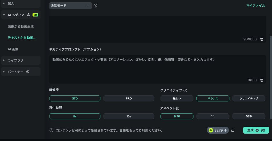 Filmoraを開いたら「テキストから動画生成」を選択すると、プロンプトを打ち込むボックスがあるので、そこにどんな動画にしたいかを書き込みます。
