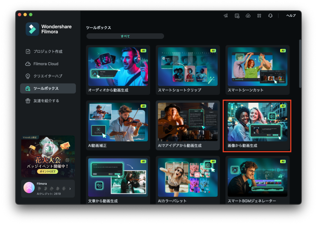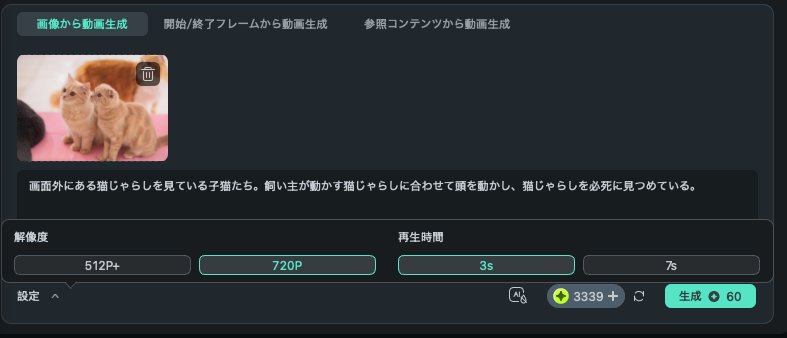 まず試したのは、FilmoraのAI機能「画像から動画を生成する」です。
