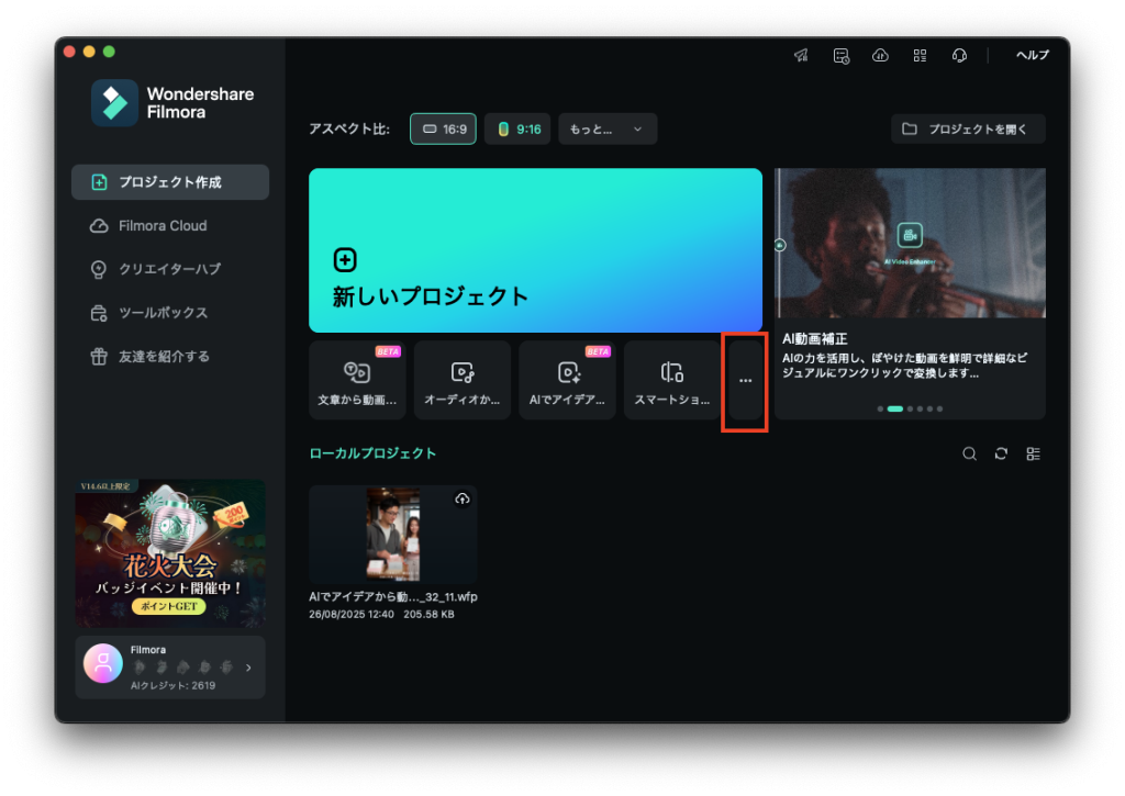 FIlmoraを開いたら、新しいプロジェクトの下に並んでいる機能の横の「・・・」を押します
