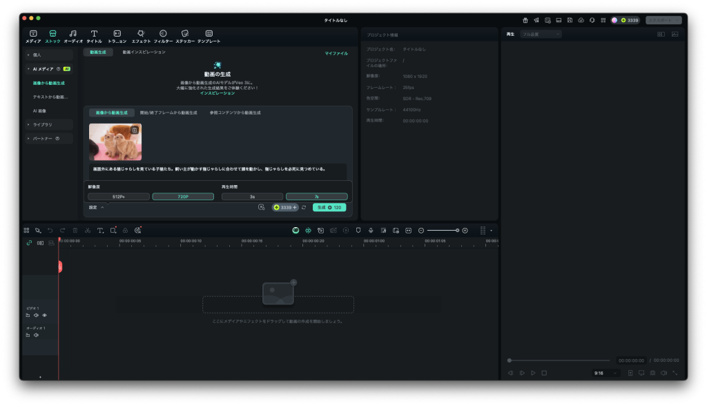Gemini Veo3とスタンダードが選べますが、Veo3になると生成にかかるクレジットが多くなるので注意してください。Veo3の方が高品質な動画になりやすいと思いますが、今回はFIlmoraのスタンダードも見てみたいと思いスタンダードを選択してみました。