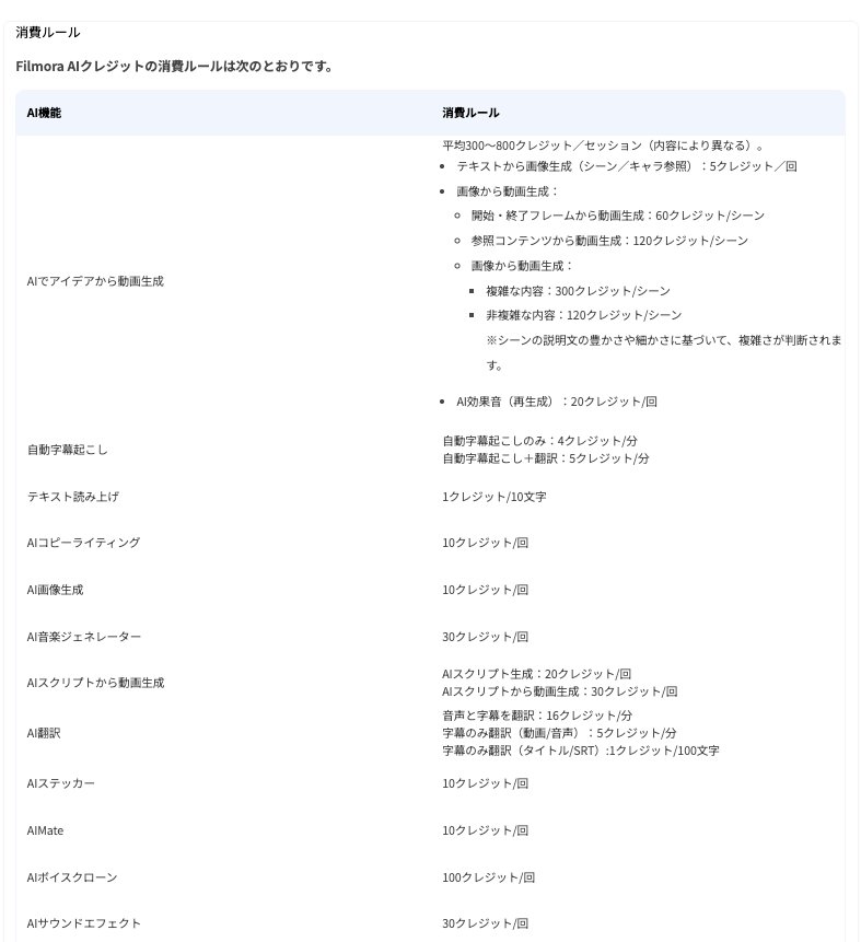 Filmora AI クレジットが大体1クレジット=1円だと分かったところで、それぞれのAI機能にかかるクレジットを見てみましょう。